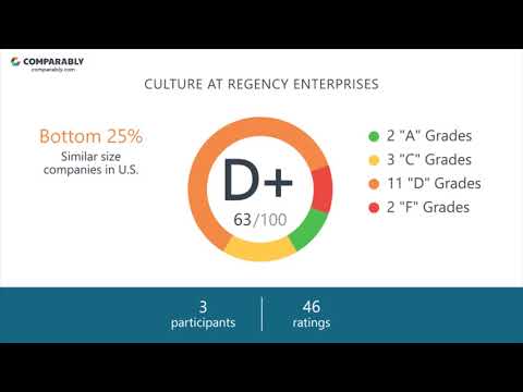 Learn more about the overall culture and interview process at Regency Enterprises from current employees. In general, based on 43 ratings and 3 employees, Regency Enterprises has an overall culture score of C- or 65/100. Regency Enterprises is ranked in the Bottom 30% of similar sized companies on Comparably.