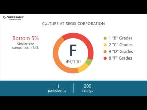 In general, based on 792 ratings and 59 employees, Regis Corporation has an overall culture score of F or 51/100. Regis Corporation is ranked in the Bottom 5% of similar sized companies on Comparably. The Customer Support department, the Sales department, and the Operations department are the most satisfied with their experience at Regis Corporation. However, Male employees, the Operations department, and employees who have been at the company 5 to 10 Years are the least satisfied.