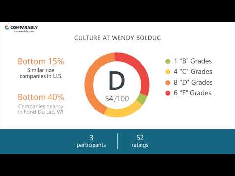 Learn more about the overall culture and interview process at Wendy Bolduc from current employees. In general, based on 68 ratings and 4 employees, Wendy Bolduc has an overall culture score of C- or 63/100. Wendy Bolduc is ranked in the Bottom 30% of similar sized companies on Comparably.